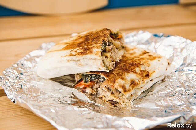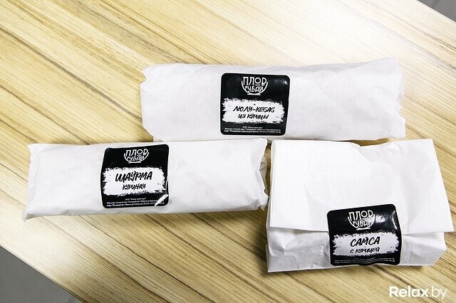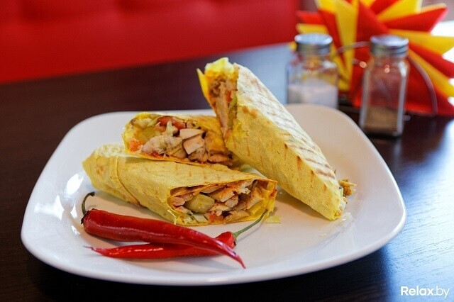 В меню представлены блюда не только восточной кухни, но еще и европейской, белорусской и азиатской. Шаурму в привычном виде здесь именуют сэндвичем. Представлены такие с говядиной (внутри ромен, маринованные огурцы, помидоры, майонез) или курицей (с чесночным соусом вдобавок к уже перечисленным ингредиентам), причем мясо внутри может быть приготовленным вариативно: в традиционном виде (кусочками), как люля или даже как шиштаук. Кто хочет посытнее, может купить шаурму в развернутом виде: куриное филе или говядина на тарелке (накрытой, естественно, лавашом) соседствует с томатами, луком, картофелем фри и соусом (а стоит 21 рубль за 520 граммов или 25 — за 545).