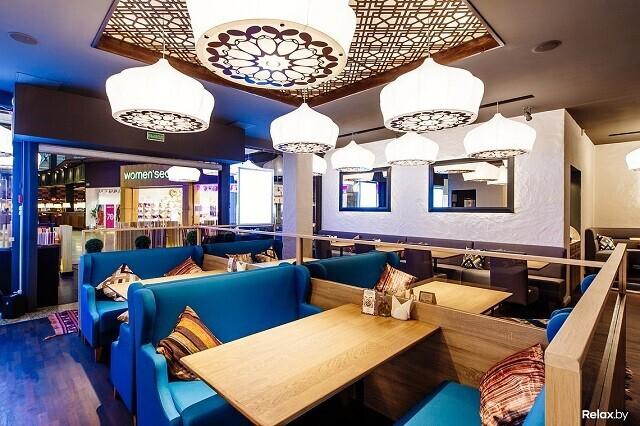 Создатели хорошо известной сети Golden Coffee открыли чайхана-кафе Kinza в ТРЦ Expobel только этим летом. Интерьер заведения лишен обилия ярких красок и орнаментов, рисунков и росписей. Все сдержанно и лаконично, как говорят тут, «традиционный восточный шик уравновесили современной простотой».