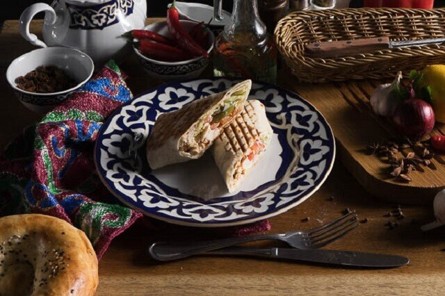В меню популярного сервиса главенствует плов в самых разных вариациях. В местной шаурме — обжаренный цыпленок, соленые огурчики, пекинская капуста, томаты и фирменный соус. Кстати, приготовлена она в специальном лаваше, а пожарена на гриле, чтобы подольше быть хрустящей.