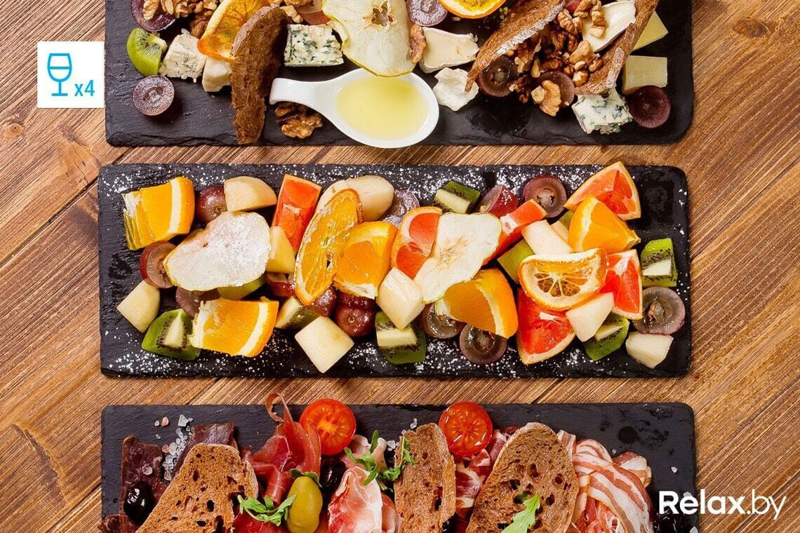 Что: мясной, сырный, фруктовый сеты + напитки