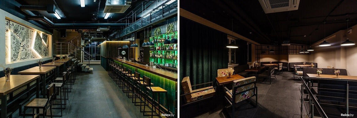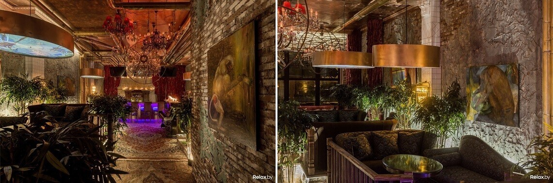 Во второй в Минске Manon bar вдохнули тот же дух, что ощущается в первом заведении; его просто поселили ближе к своим самым веселым гостям. Интерьер тут — смешение декоративных элементов, разных по стилю и настроению: например, керамическая плитка на стенах соседствует с кирпичом, кованые элементы — с тяжелыми бархатными портьерами. Стены, свободные от насыщенных фактур, заполнили картинами, которые писали именно для этого места. Из горячего тут, как в Лондоне, только бургеры и лобстеры. На открытой кухне готовят роллы и суши в 30 вариациях.