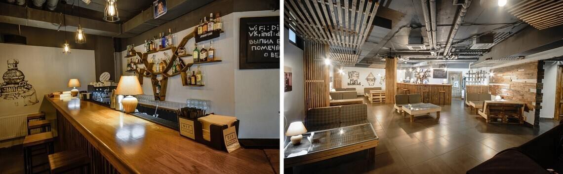 Увеселительное handmade-заведение — кальянная DIY — отлично тем, что создавалось буквально вручную: «сделай сам» (как в аббревиатуре-названии) — именно таков основной принцип внутреннего убранства. Гости говорят, это тот случай, когда бар, сделанный своими руками, выглядит очень просто, но по-дизайнерски. Здесь показывают примечательные кинокартины, делают гостям достойные кальяны, предлагают легкие закуски и напитки самого разного толка.