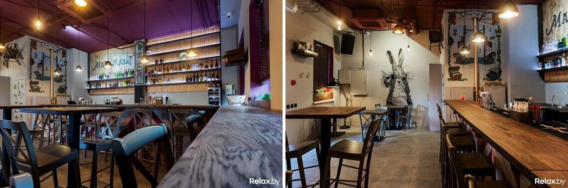 Джин-бар Mad Rabbit Bar примечателен коктейльной картой: в ней полсотни классических и авторских напитков, причем 40 из них — на основе джина (например, со сладкой морковью и листьями мяты). В меню — легкие закуски в виде брускетт, теплых тостов, фруктовых и сырных сетов, салатов и десертов. Ассоциации с «Алисой в стране чудес» приходят сами собой сразу после пересечения порога: отсылка к сказке очевидно прослеживается в интерьере. Правда, сюда, говорят создатели, попала бы взрослая Алиса.
