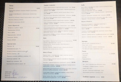 Меню, напечатанное черным по белому на картоне, сложено в три раза. Шрифт хорошо читается. На обложке красуется логотип MIXXа и клипарт поварского колпака, который контрастирует своим графическим минимализмом с остальным дизайном. Простота наблюдается и в ценах. Помимо восхваленных округленных цен, которые мы уже видели в других меню, MIXX вводит новинку: единая цена для отдельных категорий блюд. Например: все супы по 50 000 бел.руб., все десерты за 55 000 бел.руб и так далее. Подтверждение тому можно увидеть на фото. Как я всегда говорил моим студентам из БГЭУ и БГУ, меню не должно представлять собой нескончаемый список блюд, ингредиентов и цен. Меню — это очень важный инструмент. Это карта, которая ведет посетителя в его гастрономическом путешествии. Именно меню заманчиво предлагает нам попробовать новые сочетания вкусов под чутким руководством шеф-повара. В данном случае я с сожалением отмечаю, что меню написано не шеф-поваром, а скорее «маркетологом», который «рекламирует» продукты, которые ему нужно продать, оглушая нас модными словечками и придумывая на ходу. Я очень зол! Настоящая антикультура. Закуски станут более аппетитными, если их назвать “Tapas”, на испанский манер. Жаль только, что они включают в себя “Брускетту” — типично итальянскую закуску. А вот итальянское Ризотто, которое правильно отнесено в категорию “Паста и Ризотто” становится более интригующим, если его назвать “Кремоса”. А «Кремоса» (прим.ред. — «кремовидный») — это ничто иное, как прилагательное и коммерческое название марки испанского риса. Соус становится еще более эксклюзивным, если назвать его “Pappa Pomodoro”. Только вот «Pappa al Pomodoro» это суп, а не соус. После итальянского и испанского находим несколько блюд с шильдой “Sous-Vide”. И это звучит просто шикарно по-французски. До того момента, пока Вы не знаете, что это значит «в вакуумной упаковке». А еще очень важно дать знать клиенту, что используются томаты «Пилати». Wow! Вот только это «Пелати» (от итальянского “Pelati”), а не «Пилати». Это же просто значит, что они были очищены! Wow и еще раз Wow! А где же многообещающее «Меню: приморские блюда Италии и Италии»? |