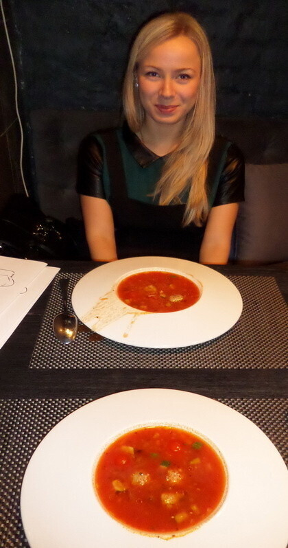 Наша официантка говорила по-английски, всегда была очень старательной и готова была помочь. Однако оказалась немного неловкой и неопытной. Суп выплеснулся из тарелки во время подачи, и она этого не заметила. Помимо этого, нам скорее давали «придуманные» ответы на мои вопросы по поводу рецептов, честнее было бы просто сказать: «К сожалению, я этого не знаю». На просьбу помочь с выбором вина, мне был дан совет сочетать Chardonnay с уткой. Однако, с таким блюдом как Magret, с хорошо выраженным вкусом, кислинкой, сладкими (слива) и нежными (пюре из сельдерея) нотками, уместнее было бы сочетать красное, слегка танинное вино, в аромате которого присутствуют тона красных фруктов.