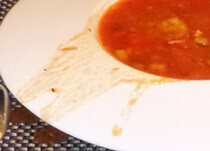 Густой бархатистый по своей консистенции соус, попадая ко мне на язык, чуть ли не застаёт меня врасплох — на удивление ощущается легкая приятная острота. Поражает сладкий и нежный лук. Он идеально приготовлен, несмотря на то, что порезан кубиками. Он сильно выигрывает на фоне чеснока, который так тяжело переваривается. Каракатицы тоже приготовлены по всем правилам. Кусочки хлеба отличного качества были подрумянены и немного поджарены, чтобы они стали немного хрустящими. Сделано это для компенсации достаточно жирной консистенции соуса. Буду надеяться, что это не те самые «Брускетте». Сочетание вкусов на самом деле восхитительное.