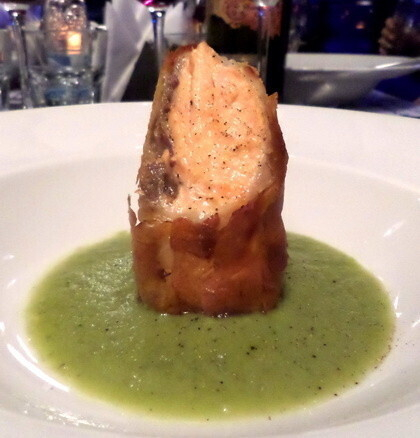 Но речь идет о жареном рисе с рагу из молодой говядины, композицию завершает жареный лук-порей. Белое блюдо украшает куркума и пыль из каперсов. Блюдо, представленное таким образом, дает ощущение утонченных блюд, которые обычно подают в ресторанах со звездами Мишелин. Правда? А вот и не правда! Это типичный миланский рецепт был придуман мамами, которые исхитрились и нашли способ заставить своих домочадцев доесть остатки ризотто, которое на следующий день после приготовления превращается в не особо аппетитную на вид массу. Из сыроватого риса делается «котлетка», которая становится хрустящей, если поджарить ее на сковородке на небольшом количестве сливочного масла. Вот отсюда и оригинальное имя это блюда «Рис в прыжке». Результат на самом деле очень богат на вкус, и это отличная возможность попробовать нестандартно приготовленный по-итальянски рис. Браво шеф-повару! Хрустящий лосось, крем из брокколи и картошки — 73 000 бел.руб.