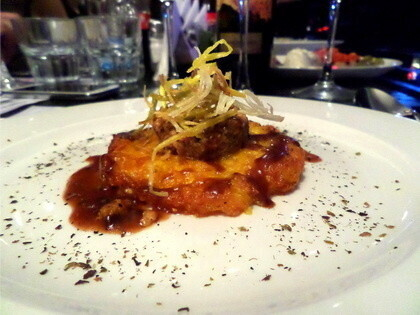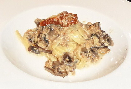 Самое большое достоинство Пармиджаны — это ее температура. Мы думаем, что еда — это только вкус. Но это не так. Слишком горячая пармиджана обжигает ротовую полость, и блюдо сразу теряет весь свой приятный вкус. Пармиджану нужно подавать теплой…как тело любовника, которое благоухает вместо привычного Chanel n.5 ароматом еще более манящим и страстным — томатного соуса и свежего базилика, который в этом случае был заменен тмином. Если выразить оценку кратко по шкале от 1 до 10, учитывая, что мы находимся за границей, я бы поставил крепкую 8. Феттуччине с грибами, рагу из молодой говядины, сухих помидоров и Пармиджано-Реджано — 68 000 бел.руб. (грибы, сушеные помидоры, пармезан, тушеная молодая говядина, сливки)