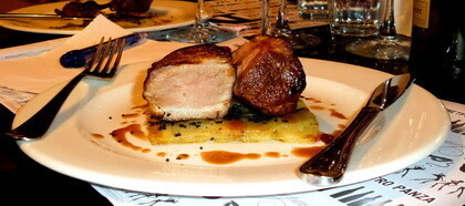 Переходим от хрустящего риса к хрустящему Лососю, поскольку последний «обернут» в тесто Филло. Все это выложено в центр подушечки из крема, ингредиентами которой являются брокколи и картошка. Идеально приготовленный лосось. Настолько, что нежность, влажность и цвет его мяса идеально сохранены. Восхитительное сочетание с брокколи и картошкой. Жаль, что картошка соленая и что из семги не была убрана зрительно более темная часть (слева), которая немного раздражает наслаждение красивейшим красноватым цветом рыбы, но в первую очередь раздражает на вкус, потому что эта часть мяса более жирная и отдает чешуей. Ошибки могут проскакивать, особенно если в заведении полно народу и кухня перегружена работой. Главное, чтобы ошибка не влияла (как это зачастую случается) на выставленный нам счет. Но это не относится к Ресторану-клубу «Nero». Я пожаловался на избыточное количество соли, и мне на стол принесли новую порцию идеально приготовленного лосося. Этому примеру столичным друзьям-рестораторам стоило бы последовать! Свиная шейка с картофелем — 97 000 бел.руб.