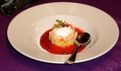 Это тот самый настоящий Тирамису, сделанный из Маскарпоне, поданный в кружке из-под кофе. И именно кофе является одним из опасных ингредиентов при приготовлении данного десерта. Его количество должно быть осторожнейшим образом рассчитано, с одной стороны для того, чтобы сбалансировать вкус сахара, содержащегося в креме, а с другой стороны, чтобы не оставлять во рту деревянный тяжелый вкус. И если уж быть совсем перфекционистом, использован был отличный кофе Pareo. Особенность его обжарки заключается в том, что зерна обжариваются на дровах. Если вы хотите получше его распробовать, закажите вместе с Тирамису чашечку ароматного эспрессо. Суп из свежих фруктов — 29 000 бел.руб. Кубик очень свежих фруктов, соус из свежей клубники, свежий аромат мяты. В общем, это блюдо посвящено свежести и простоте и изысканности вкуса. Идеально для тех, кто в конце трапезы хотел бы чего-нибудь легкого (в том числе и по цене) и ароматного.