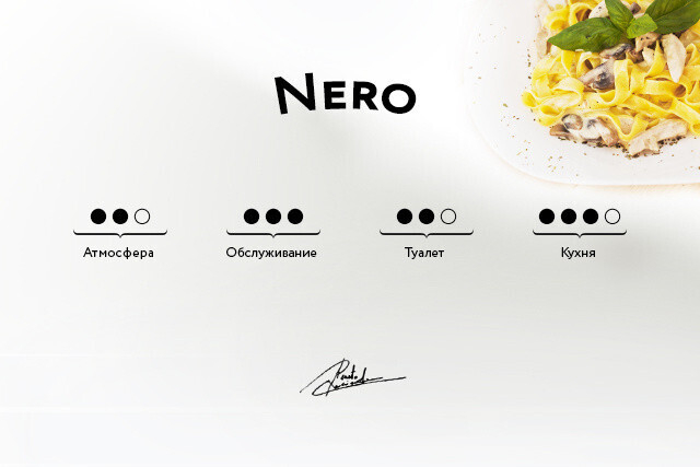 АТМОСФЕРА Внешний облик ресторана впечатляет стеклянными черными дверями, которые выглядят монолитно на фоне светло бежевых панелей, покрывающих фасад здания. Очень гламурно выглядит и освещенная неоновым светом с обратной стороны буква “N”.Я понимаю, что собираюсь зайти в заведение, созданное отнюдь не с провинциальной логикой. И вправду, обстановка продумана до мелочей и склоняется к элегантному, немного перенасыщенному русскому стилю. Как вы сами можете убедиться, Ресторан-клуб «Nero» скорее клуб, чем ресторан. Первоначально это смущает клиента в выборе обеденной зоны и столика. Помимо прочего, пустой клуб — это, пожалуй, не самая благоприятная обстановка для обеда. Хорошая новость заключается в том, что скоро появится внешняя терраса, которая будет отдана исключительно ресторану. Выбор бумажных салфеток соответствует уровню паба или кафе, но не уровню ресторана. Столовые приборы и кухонная утварь приятно просты в стиле и в обращении. |