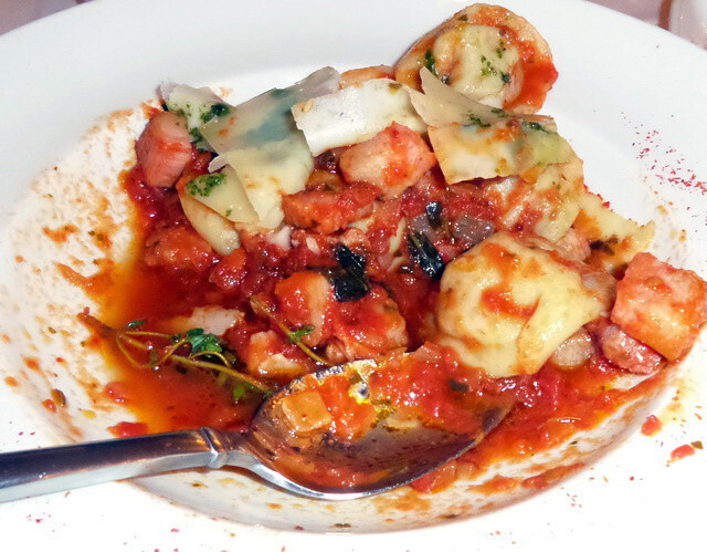 Единственное блюдо, которого стоит избегать. Не будем принимать во внимание тот факт, что равиоли на самом деле квадратные и что соуса «Помодоро» не существует, отметим лишь то, что псевдо-итальянские псевдо-равиоли – это на самом деле пельмени в излишне перегруженном на вкус соусе.