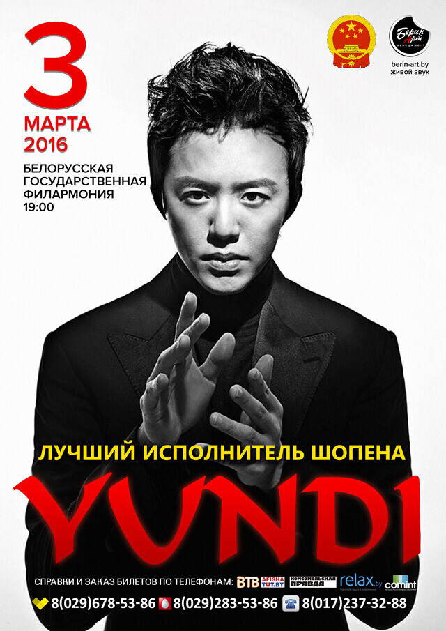 Всемирно известный китайский пианист, Юнди Ли, выступит в Минске 3 марта 2016г. на сцене Белгосфилармонии. Китайский виртуоз Юнди – на сегодняшний день является одним из самых успешных и востребованных пианистов в мире. Он ворвался на международную сцену музыки в 2000 году после блистательной победы на престижном Международном конкурсе пианистов имени Шопена в Варшаве. Это произвело сенсацию – никогда ещё столь юный пианист не удостаивался этой премии! Юнди Ли тогда было всего лишь 18 лет.