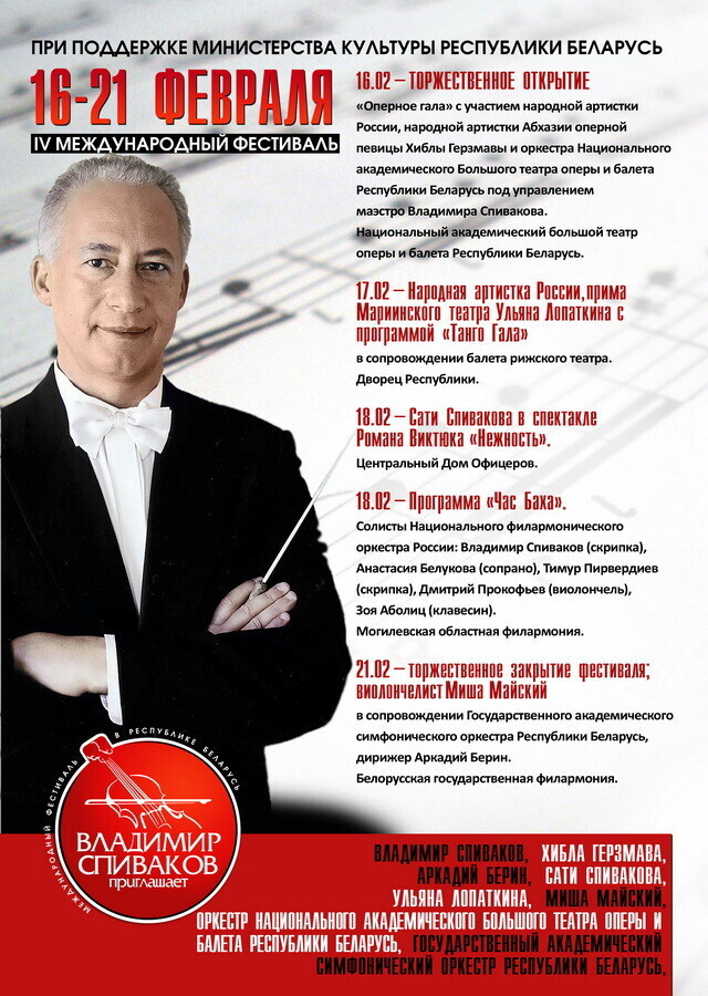Справочно: IV Международный фестиваль «Владимир Спиваков приглашает» пройдет в Минске и Могилеве с 16 по 21 февраля 2016 года. В рамках фестиваля запланированы выступления Хиблы Герзмавы («Вива ла Опера»), Ульяны Лопаткиной («Аргентинское танго»), Сати Спиваковой (в спектакле Р. Виктюка «Нежность»), Миши Майского (виолончель), а также программа «Час Баха».