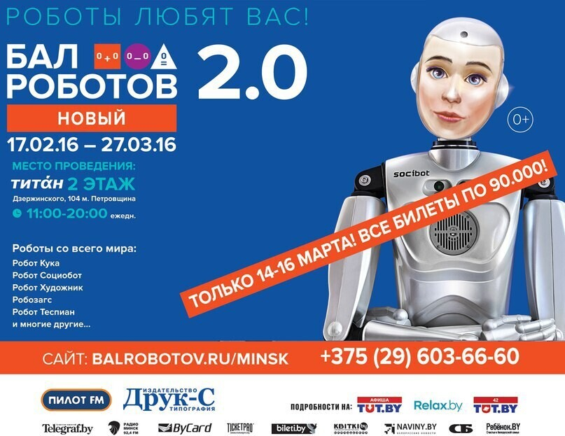 Всемирно известные роботы гостят в столице Беларуси уже пятую неделю. За это время интерактивная выставка-шоу «Бал роботов 2.0» успела завоевать симпатии и стать любимым местом семейного отдыха минчан. Выставку уже посетило более 15000 человек. Так что, если вы еще не в их числе, предлагаем для вас отличную мотивацию – 15-16 марта цена на все билеты для детей и взрослых составляет всего 90000 руб, Поспешите воспользоваться существенной скидкой и при этом получить полный пакет впечатлений на международном слете роботов в ТРЦ «Титан» (2 этаж, пр. Дзержинского, 104).