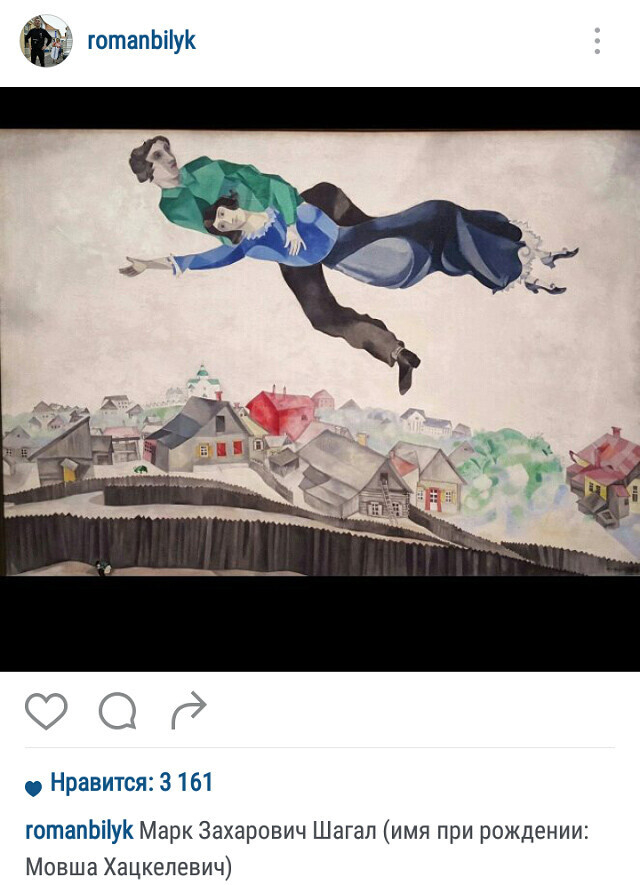 Причем лайки он собирает, даже если постит что-то не совсем стыкующееся с привычным стереотипом о группе «Звери». Например, Рома – любитель живописи. Переснятая им картина «Над городом» знаменитого витебчанина Марка Шагала получила от поклонников больше 3 тысяч лайков.