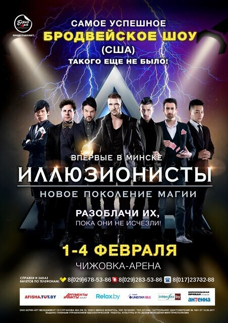 Бродвейское - это сногсшибательное зрелище в исполнении самых потрясающих иллюзионистов на Земле. Побив все возможные рекорды продаж по всему миру, оно восхищает аудиторию всех возрастов мощной комбинацией самых отважных и удивительных трюков, которые когда-либо исполнялись на сцене. Действо наполнено волнующей и изощренной магией в невероятных пропорциях.