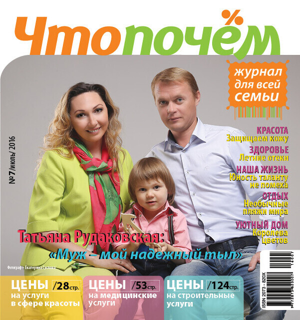 На обложке июльского номера – талантливый журналист, сценарист, радиоведущая и заместитель директора дирекции утреннего вещания телеканала ОНТ Татьяна Рудаковская с мужем и сыном.