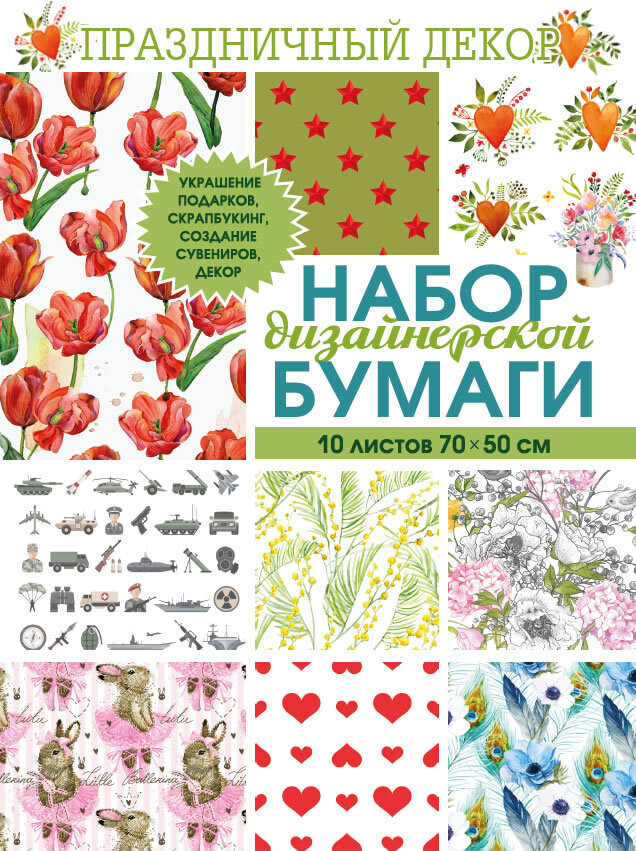 В набор входит 10 листов дизайнерской бумаги 70x50 см, 10 мини-открыток и 10 идей – все, что нужно для того, чтобы с удовольствием поздравить близких и любимых с Днем святого Валентина, 23 февраля и 8 марта и превратить сам процесс подготовки подарков в праздник!