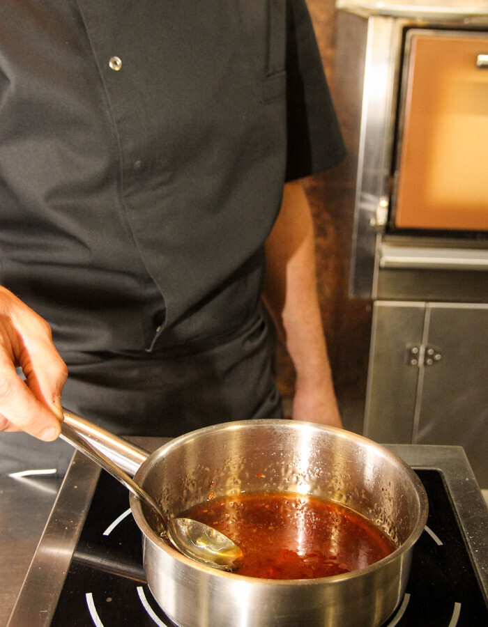 - 03Сразу за соевым соусом добавляем следующий ингредиент – сладкий соус чили. Его можно получить двумя путями: сделать самому в домашних условиях либо купить. Шеф-повар подчёркивает, что такой соус очень легко найти на прилавке любого современного супермаркета, но и приготовление дома труда не составит. Итак, выпариваем полученную смесь ещё несколько минут непрерывно помешивая.