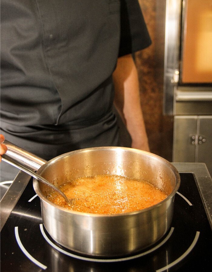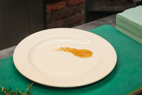 В итоге у нас должна получится янтарная тягучая масса. Узнать готов ли наш соус к добавлению следующего ингредиента очень просто: необходимо лишь взять чистую тарелку и сделать пару капель полученной смеси на неё. Если соус медленно стекает по тарелке, то можно смело переходить к следующему шагу.