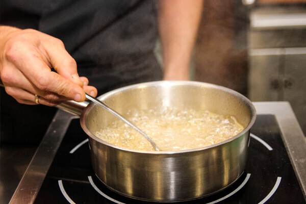 - 01В заранее приготовленную ёмкость выливаем 200 грамм яблочного сока. Туда же высыпаем 60 грамм сахара. Полученную смесь ставим выпариваться на высокой температуре, постоянно помешивая. Процесс выпаривания занимает не более трёх минут.