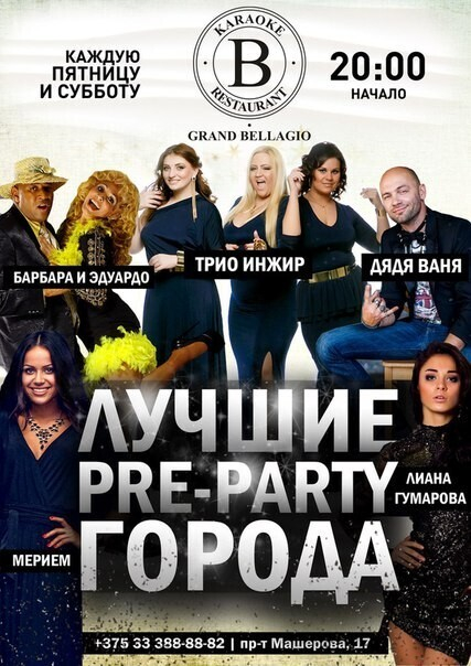 Новый виток эволюции Минских pre-party привнес ресторан «Grand Bellagio», который решил ангажировать название pre-party для своих мероприятий в. Теперь в ресторане каждый уик-энд самые топовые минские музыканты,а так же тематические мероприятия. Вечеринки проходят с 8 до 01:00,за это время гости ресторана успевают попробовать фирменные коктели и угощения. Все пятницы октября посвящены культовым музыкантам,таким как Джо Коккер, Стинг, Лени Кравиц, Машина Времени, Jamiroquai в исполнении Дяди Вани, Юрия Селезнева, Трио Инжир, Александры Степановой, группы Tomato Jam, Ксении Бароновской, Лианы Гумаровой, Анны Рай. Субботние pre-party проходят же с определенной тематикой совместно с еженедельным проектом "Звезда за баром"-звездный гость совместно с барменом заведения готовит фирменный коктейль,которым и угощаются гости.