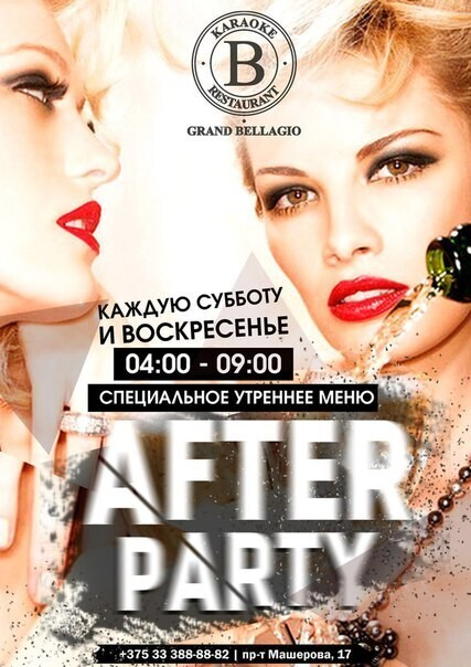 Поскольку ресторан Grand Bellagio работает круглосуточно и семь дней в неделю: в ночь с пятницы на субботу и с субботы на воскресенье с 4 утра начинается формат afterparty. Для гостей ресторана играют самые трендовые ди-джеи,а так же все угощаются специальным суповым меню.