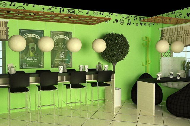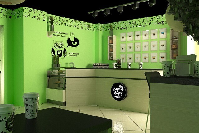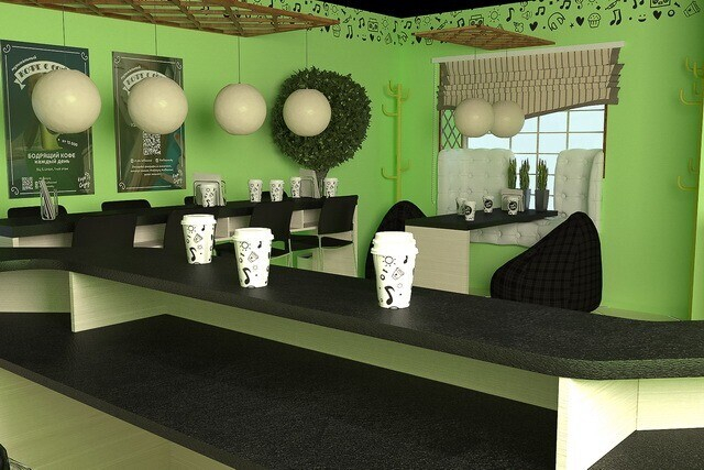 Для оформления кофейни был разработан индивидуальный дизайн-проект, который получает каждый партнер сети, желающий открыть свою кофейню.