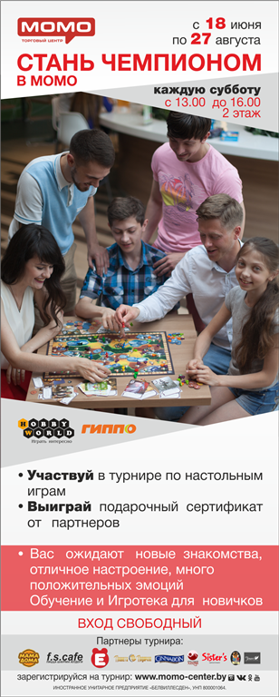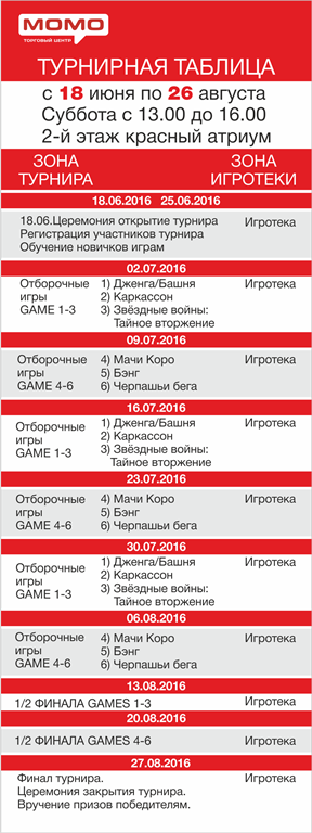 ТЦ «Момо» — это городская площадка. В дни летних каникул детям и семья хочется весело провести время. Торговый центр «Момо» предоставляет возможность провести время всей семьей, завести новые знакомства, создать себе отличное настроение и получить море положительных эмоций. В турнире участвуют следующие настольные игры: Дженга, Каркасон, Звёздные войны (Тайное вторжение), Мачи Коро, Бэнг, Черепашьи бега.
