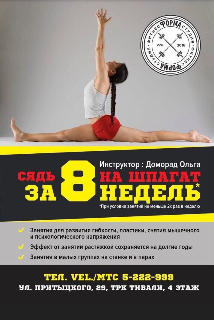 Многие задаются этим вопросом. Это индивидуальный вопрос и каждому человеку потребуется разное количество времени. Не спешите, чтобы не возникло травм. Инструктор групповых программ Фитнес студии "Форма" Ольга Доморад готова посадить любого человека на шпагат за 8 недель, при регулярных занятиях. Занятия проходят 3 раза в неделю ВТ, ЧТ - 20:00, СБ 12:00. Стоит помнить, что хорошая растяжка – это очень полезное свойство для людей любого возраста. Прежде всего, она говорит об отличном состоянии позвоночника и отсутствии отложений солей в суставах. Это умение также означает наличие эластичных развитых мышц и великолепной гибкости.