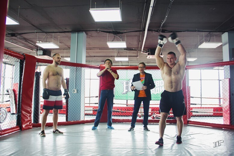 А дальше ведущие начали перечислять выдуманные заранее регалии: 46 боев на профессиональном ринге и ни одного поражения, мастер спорта по боям без правил, Чемпион Европы по ММА, Чемпион Беларуси по ММА, обладатель кубка мира по ММА 2015 года. Под дерзкую канонаду этих регалий на ринг вышел грозный амбал раза в 2 крупнее каждого из участников. Роль борца-тяжеловеса исполнил старший тренер фитнес-центра Адреналин Станислав Счастный.