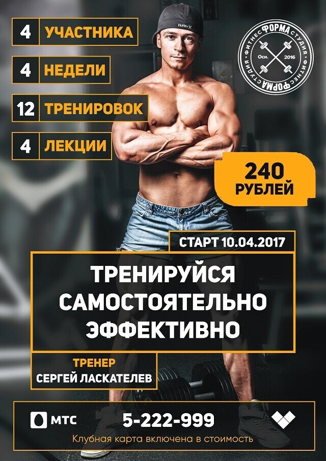 В связи с этим я хочу запустить свой обучающий курс «Тренируйся самостоятельно эффективно!». Это не персональные тренировки, это не лекции. Мой курс - это и то, и другое. Я хочу , чтобы вы НАУЧИЛИСЬ ТРЕНИРОВАТЬСЯ САМОСТОЯТЕЛЬНО, чтобы вы поняли, где черпать мотивацию и как двигаться вперёд!