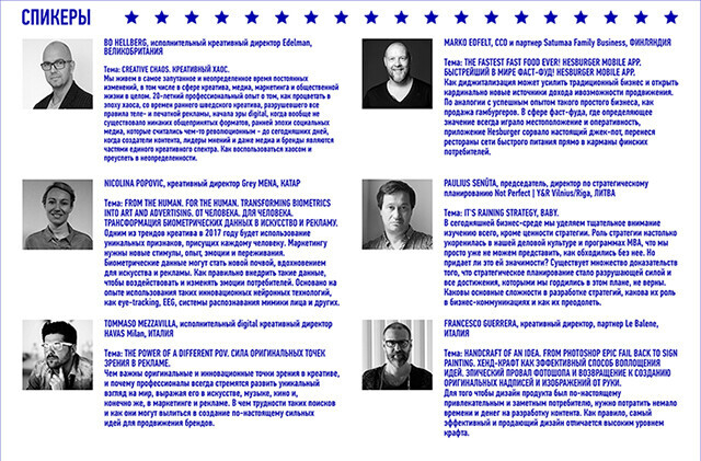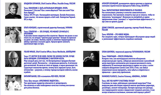 Программа девятого фестиваля стала одной из самых звездных и насыщена первоклассными активациями от известных спикеров, в том числе членов жюри фестиваля, на счету которых более 130 наград Cannes Lions. Всего на фестивале более 75 мастер-классов, семинаров, шоу-лекций, дискуссионных панелей, блиц-конференций и даже моноспектакль.