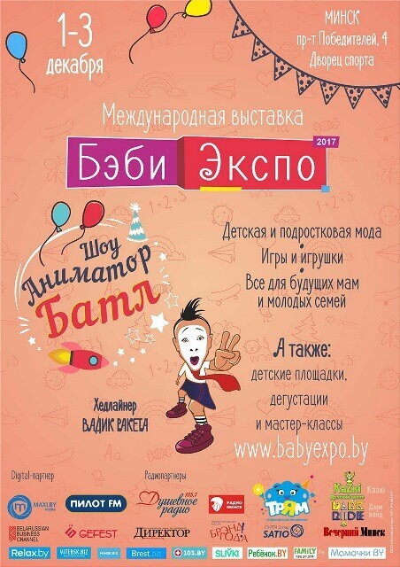 1-3 декабря в Минском Дворце спорта пройдут международная выставка «БэбиЭкспо» и шоу-конкурс «Аниматор-батл»! Посетителей ждет активная программа с выступлениями артистов-аниматоров, семейными кулинарными мастер-классами, игровыми зонами для детей разных возрастов и экспозицией новинок детских товаров и услуг.