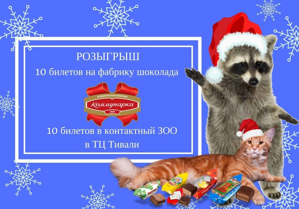 С 11 декабря в контактном зоопарке в ТЦ Тивали стартует акция для детей и взрослых – мы дарим 10 билетов в путешествие на шоколадную фабрику Коммунарка, а также 10 пригласительных билетов на экскурсии в контактный зоопарк.