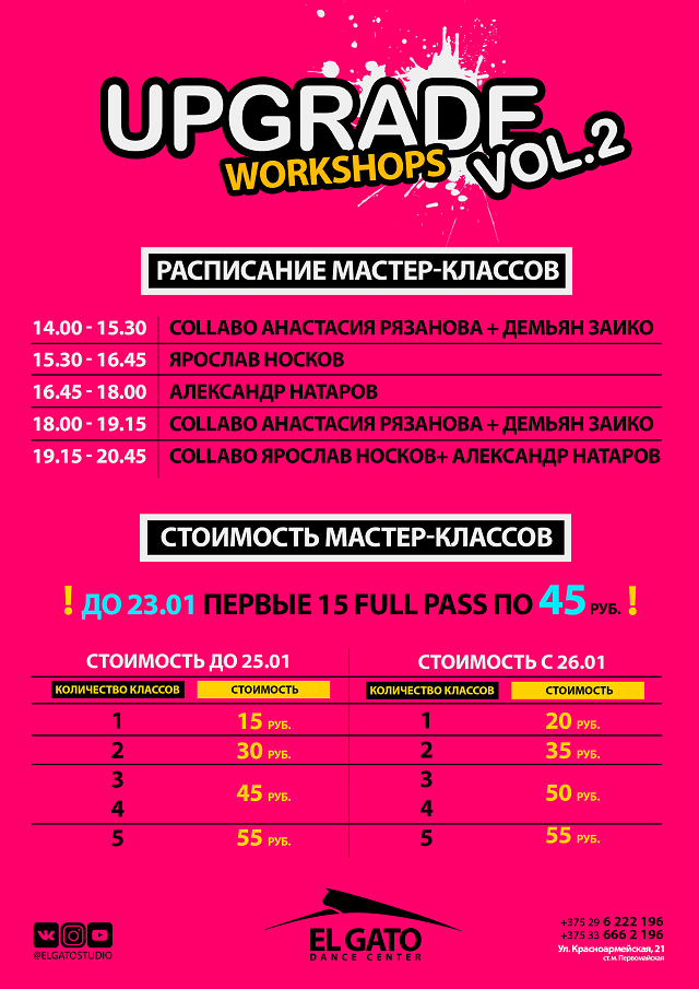 28 января (воскресенье) в 14:00 в El Gato Dance Center состоится 5 мастер-классов по направлениям Hip-hop choreo и Jazz-funk от топовых представителей этих стилей у нас в Беларуси и за рубежом.