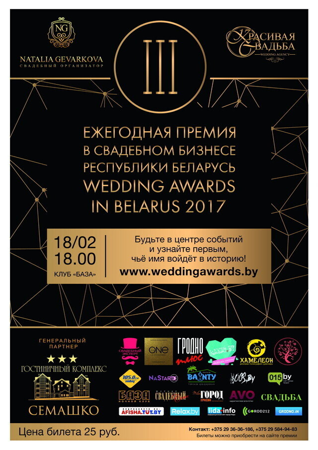 А 18 февраля в самом элитном клубе г.Гродно «База» состоится кульминация Премии - торжественное награждение победителей. Билет на церемонию можно приобрети всем желающим на сайте премии weddingawards.by (https://weddingawards.by ). Количество мест ограничено.