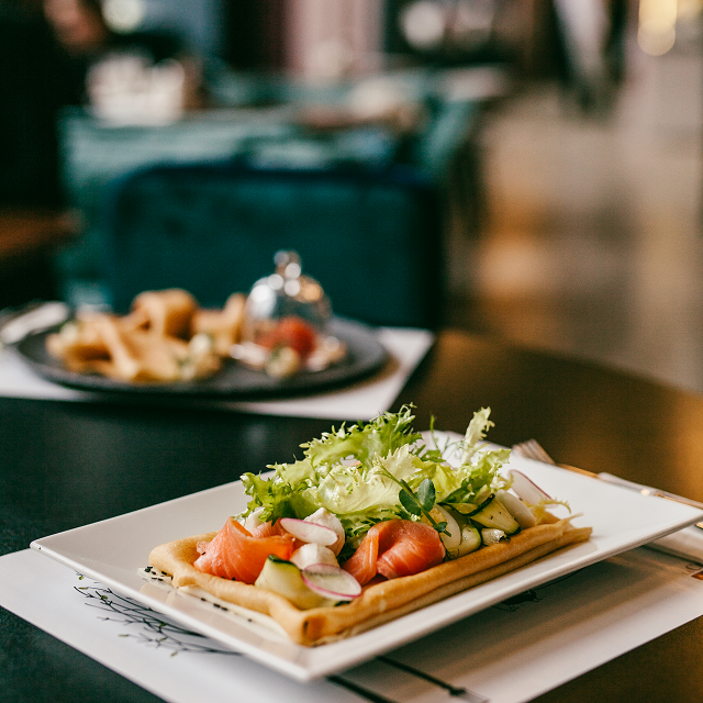 -блины с лососем, перепелиными яйцами и микс-салатом, 300гр - 12.00 руб.
