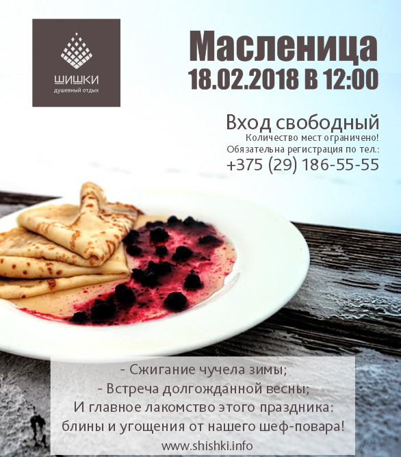 18 февраля 2018 в 12:00 года мы вспомним традиции этого чудесного праздника, совершим обряд сжигания чучела и позовем долгожданную весну. Ну и конечно, для всех гостей главное лакомство этого праздника – блины и угощения от нашего шеф-повара!