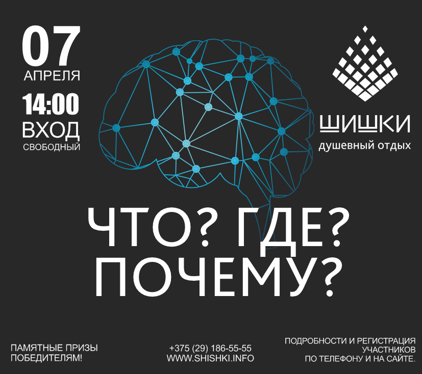 Загородный комплекс «Шишки» приглашает гостей на интеллектуальную игру «Что? Где? Почему?». Вас ожидают неожиданные вопросы, напряженные моменты и сладкий вкус победы!