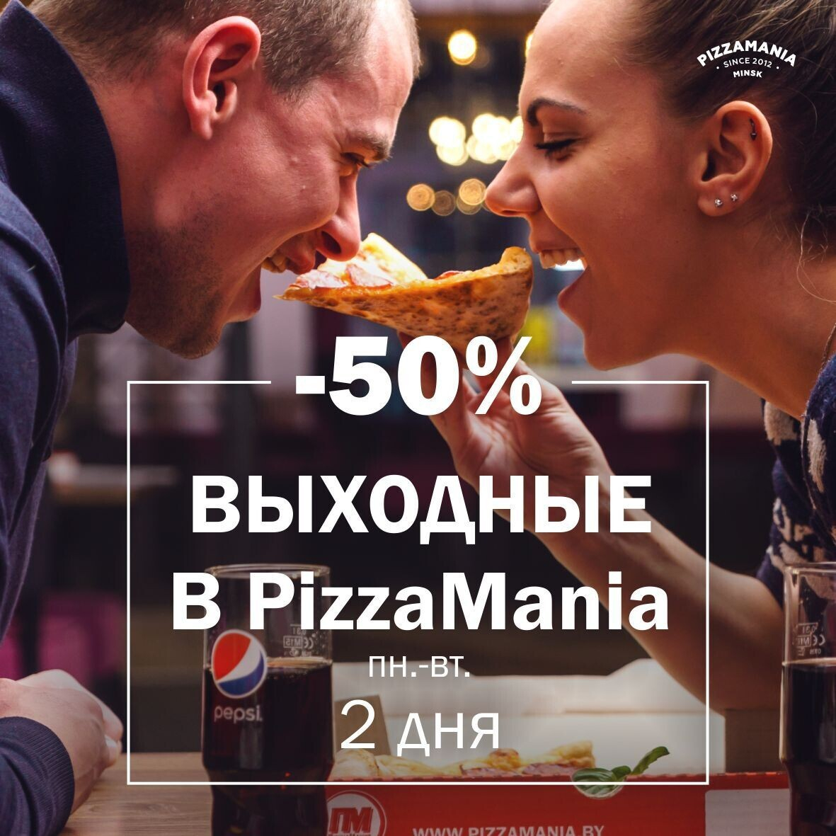 Дорогие друзья! Сеть городских кафе «ПиццаМания» подготовило для вас отличное воскресное предложение! Только 16-17 апреля при посещении любого из шести кафе г. Минска вы получаете по-настоящему огромную скидку в размере 50%. Теперь мы стали еще доступнее. Воспользуйтесь этим честным предложением.