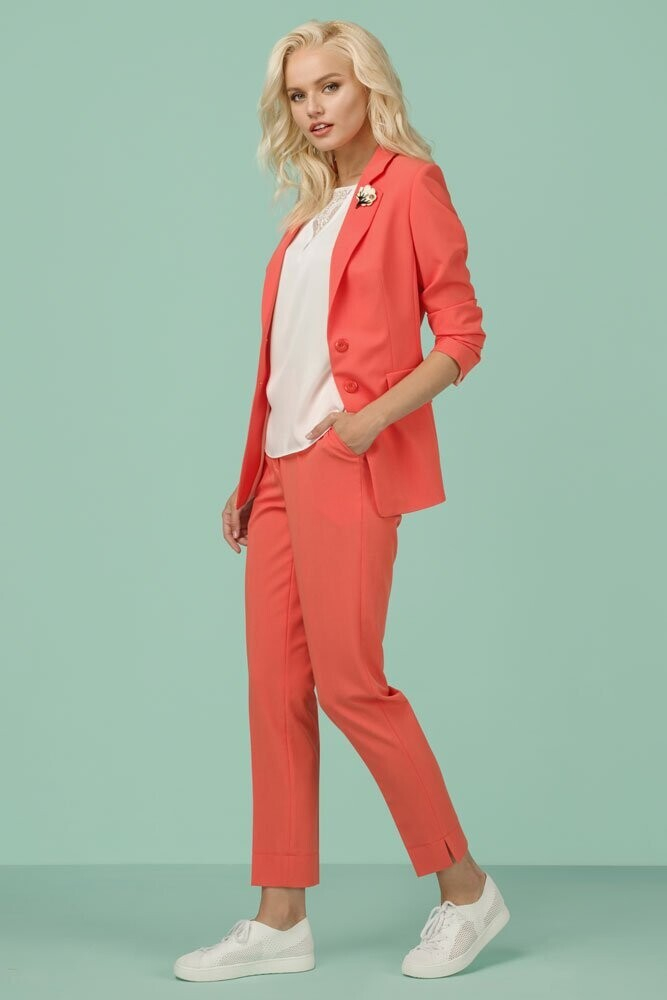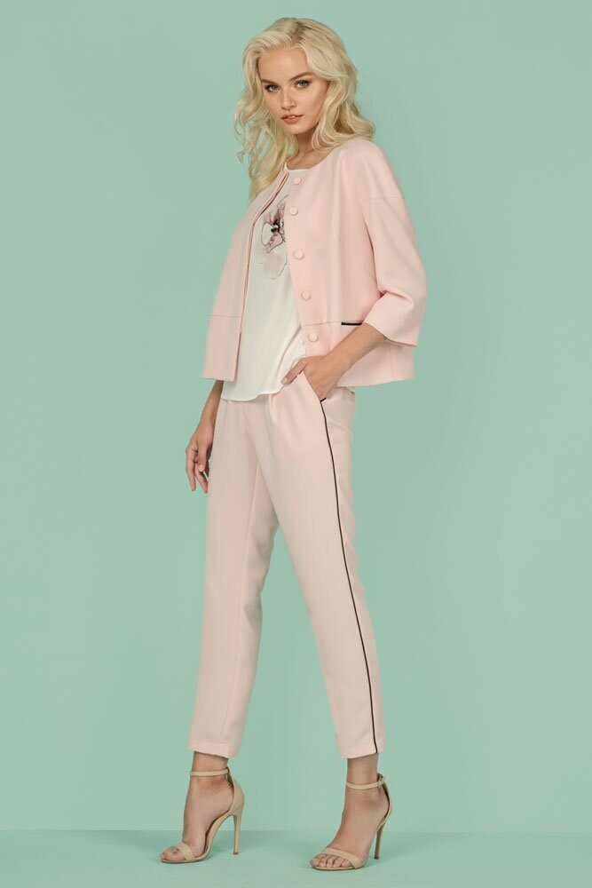 Разбеленно-розовый комплект – это воплощение женственности в офисных реалиях. Удобно то, что костюм можно носить как с элегантными босоножками, так и со светлыми кедами.