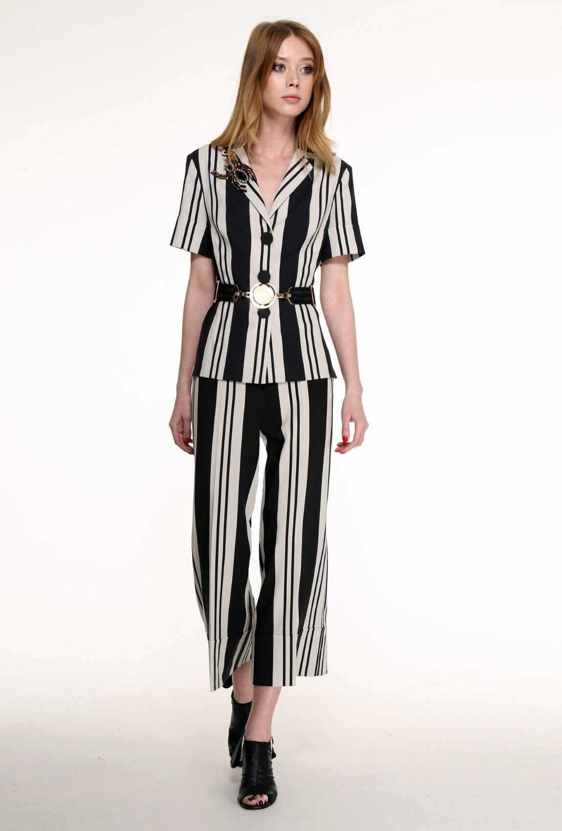 Костюм в вертикальную полоску визуально удлинит силуэт, а пояс создаст акцент на талии. Комплект, который подчеркивает все достоинства фигуры.