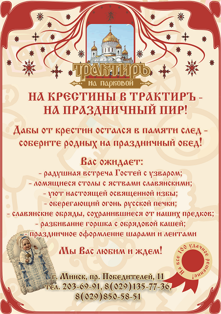 Очень популярны в Трактире воскресные семейные обеды и особенно Крестины! В Трактире очень душевная атмосфера и положительная энергетика, поэтому крепким семьям и молодым родителям в Гостях всегда очень комфортно!