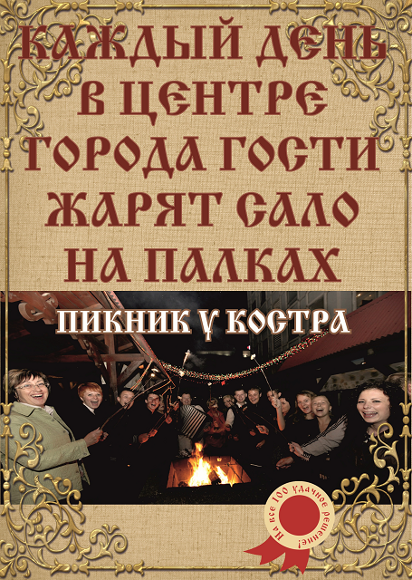 Каждый вечер Трактиръ устраивает настоящий пикник в центре города : Гости жарят сало на палках да под песни баянистов.
