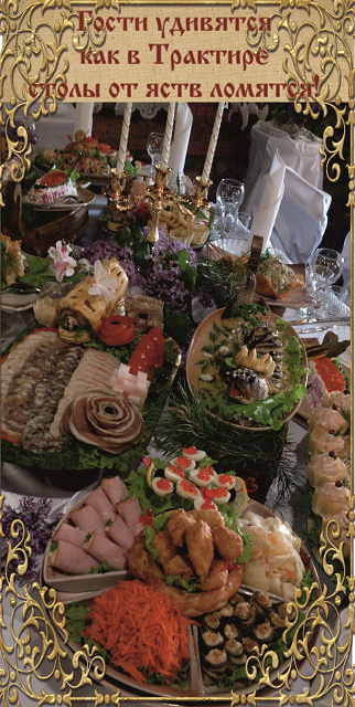 Полюбуйтесь на столы – они ломятся от яств! Вкуснота и загляденье всем на удивленье! В Трактире есть несколько вариантов банкетного меню. В настоящее время люди все чаще проводят семейные мероприятия именно в день, когда человек родился, поэтому в Трактире шумно и весело с понедельника по воскресенье.