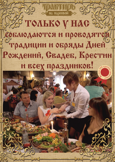 Каждый праздник в Трактире проходит с соблюдением славянских традиций и обрядов наших предков! В подарок Гость получает фирменную Трактирскую газету с подробным описанием множества славянских примет и обычаев, связанных с празднованием Дня Рождения, Свадеб, Крестин и другие приятные подарки.