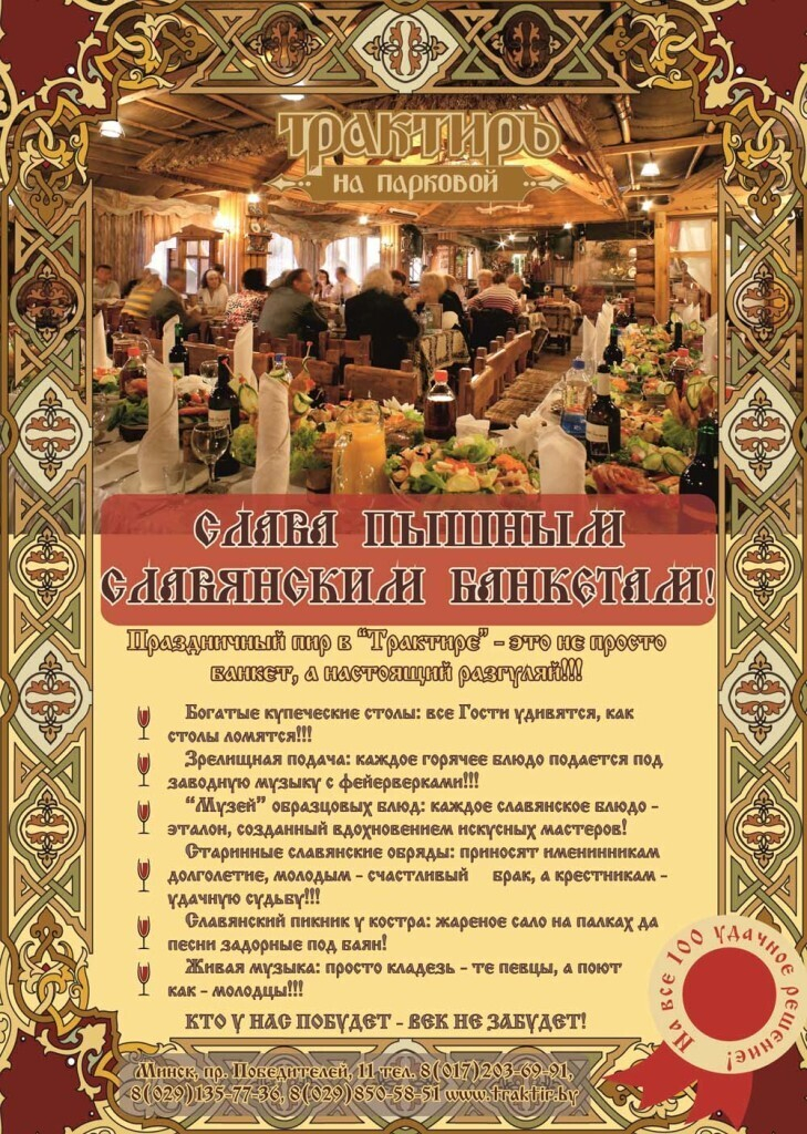 Трактиръ знаменит пышными славянскими банкетами, радушием и гостеприимством, соблюдением народных традиций и обрядов, шоу-подачей фирменных блюд, атмосферой радости и веселья, замечательной музыкальной программой, пикником на открытой площадке, настоящей русской печью в зале, лучшими блюдами славянской жаровни! По любому поводу Трактиръ — на 100% удачное решение! Так почему же именно Трактиръ – это праздник для Гостя от входа до выхода?