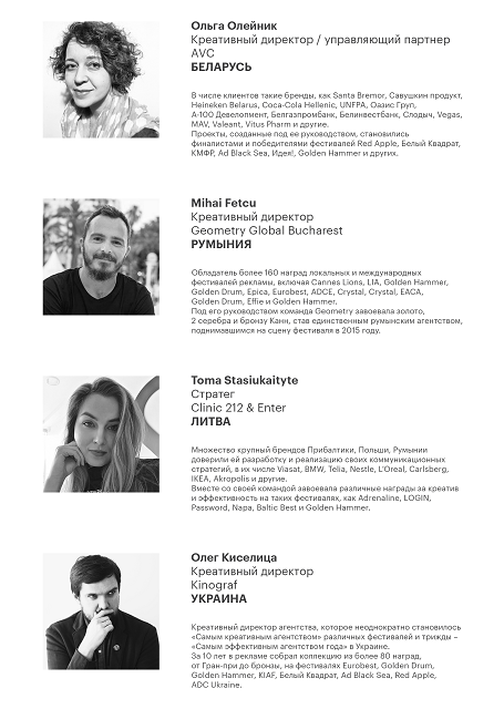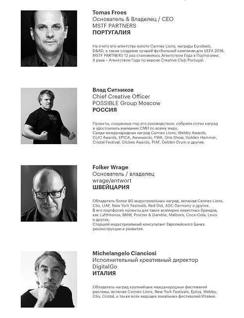 В течение трех дней – 17, 18 и 19 апреля – в программе фестиваля пройдет свыше 70 мастер-классов от персон, представляющих собой авангард мировой индустрии маркетинга и рекламы благодаря созданию неординарных и эффективных коммуникаций для крупнейших брендов, которые расскажут о возможностях развития бизнеса посредством творчества, а также о путях поиска креативных идей, успешно решающих бизнес-задачи брендов. Поэтому неудивительно, что более 70% аккредитованных участников фестиваля ежегодно – директора по маркетингу и маркетологи компаний из различных сфер деятельности.